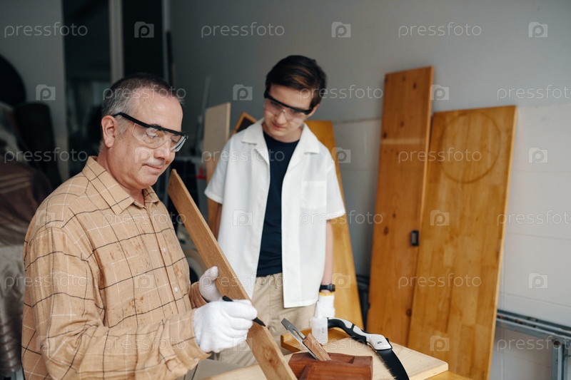 Мальчик помогает своему дедушке в мастерской