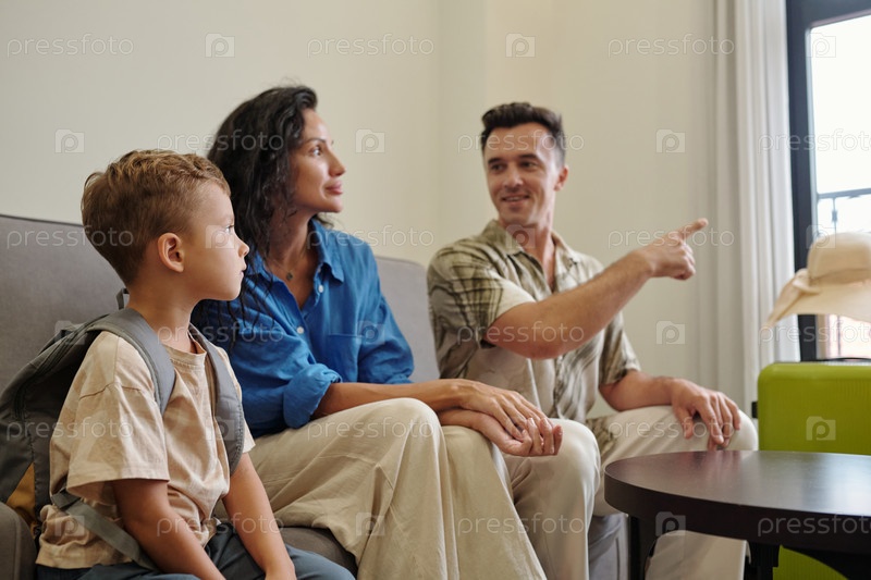 Улыбающаяся семья, сидящая вместе в яркой гостиной