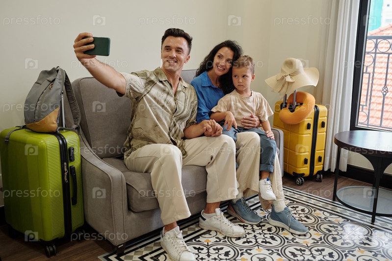 Семья делает селфи на каникулах в гостиной