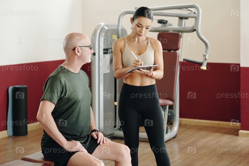 Обучение старшего мужчины с личным тренером в Gym Equipment