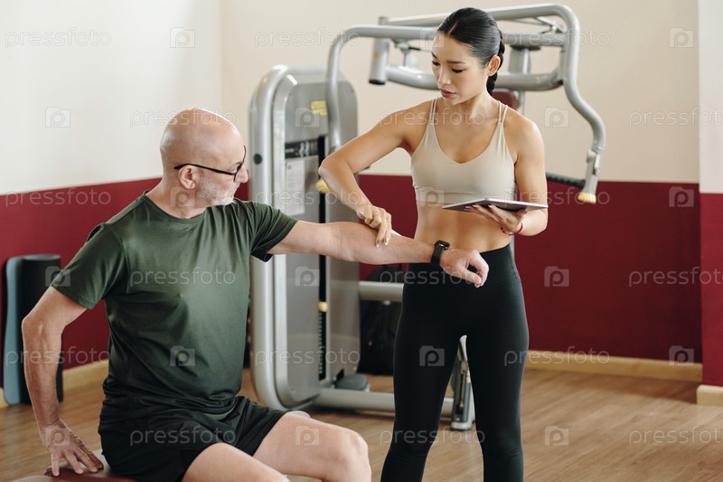 Помощь пожилому человеку с упражнениями на руках в спортзале