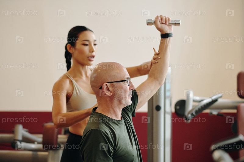 Помощь старшему человеку с силовым тренировочным оборудованием