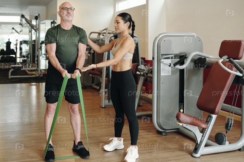 Помощь пожилому человеку с упражнениями сопротивления в тренажерном зале