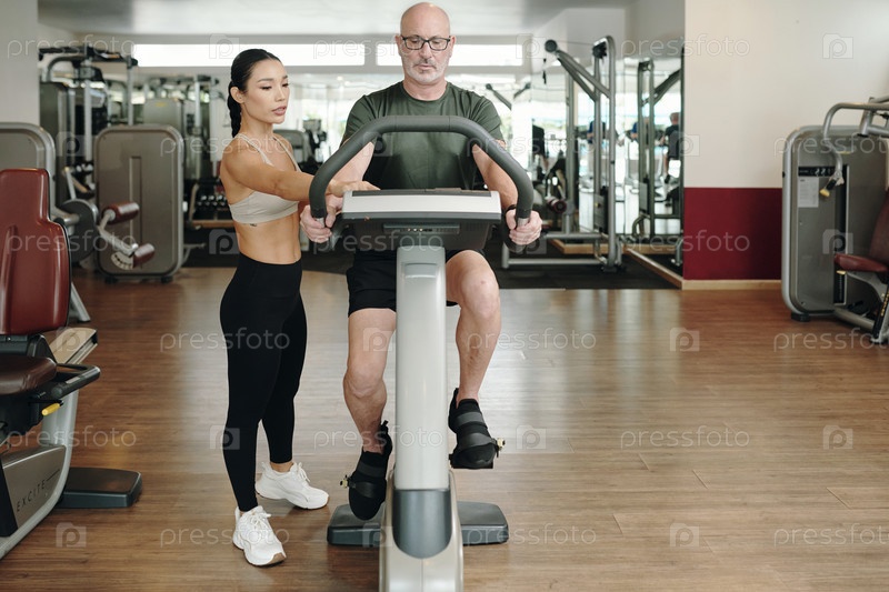 Фитнес-тренировщик помогает пожилому человеку с помощью велосипеда