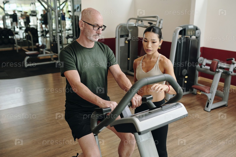 Упражнения на беговой дорожке с личным тренером в спортзале