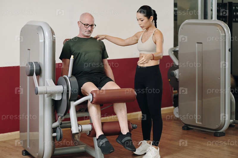 Помогая старшему человеку заниматься спортом на тренажерном зале с помощью тренера