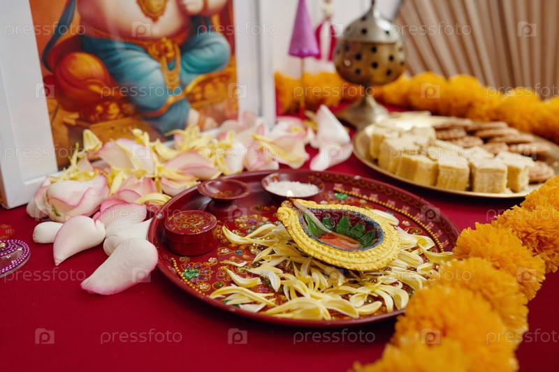 Празднование традиционного индийского фестиваля с ритуальными предметами