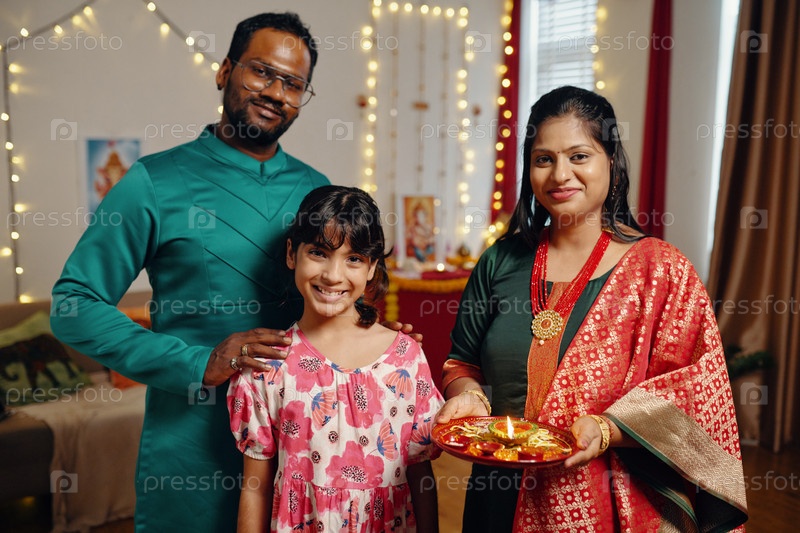 Празднование Дивали с семьей в украшенном доме
