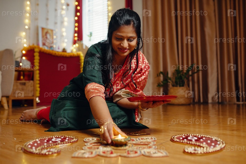 Создание дизайна ранголи во время традиционного празднования фестиваля