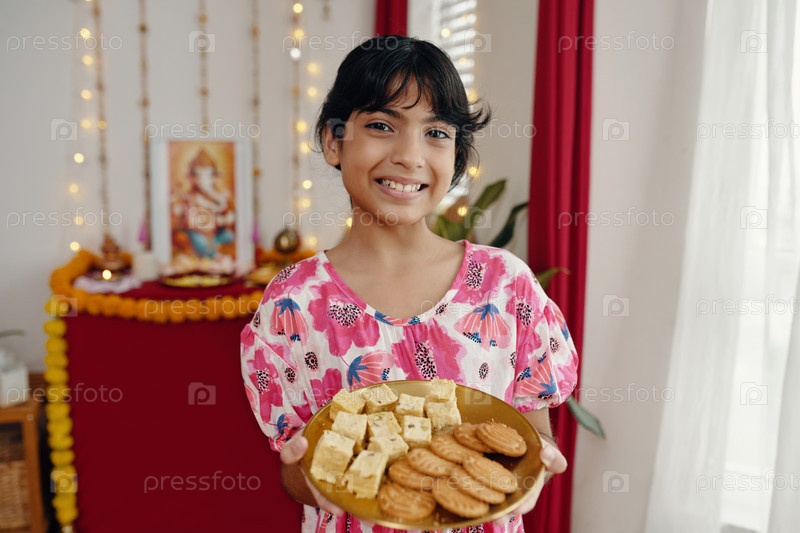 Улыбающаяся девушка держит тарелку с традиционными индийскими закусками