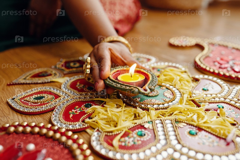Празднование Дивали с традиционными масляными лампами и ранголи