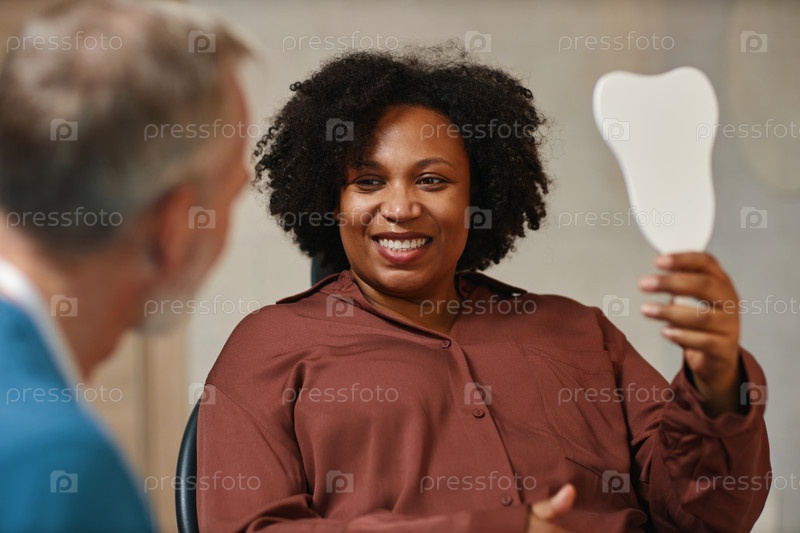 Улыбающаяся афроамериканская женщина держит зеркало во время встречи