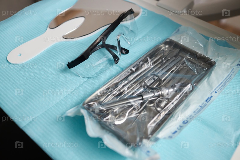 Устройство стоматологических инструментов на синей медицинской подносе