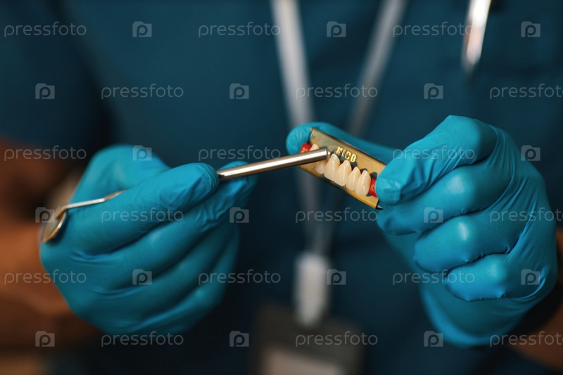 Обращение с стоматологическими инструментами практиком в синих перчатках