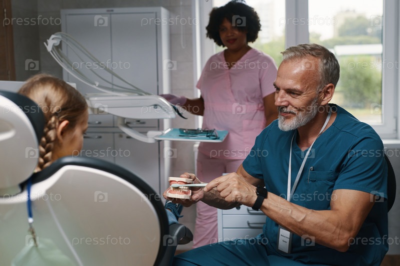 Детский стоматолог, ухаживающий за молодым пациентом во время осмотра