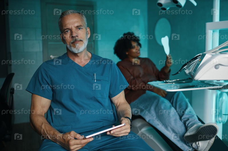 Портрет старшего врача, держащего цифровой планшет в экзаменационной комнате