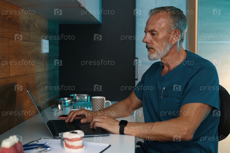 Стоматолог использует ноутбук на своем рабочем столе