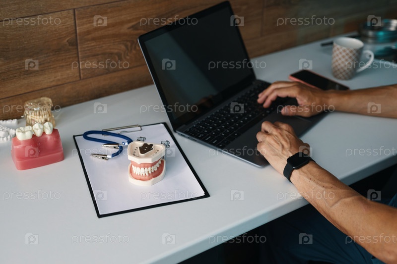 Работа на ноутбуке рядом с зубными инструментами в стоматологической клинике