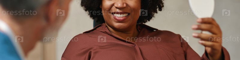 Портрет улыбающейся женщины, держащей рефлексивный объект