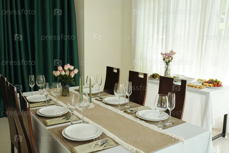 Установка обеденного стола с цветами и посудой