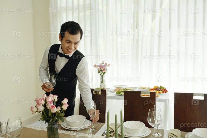 Улыбающийся официант готовит элегантную установку обеденного стола