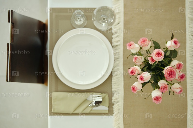 Настройка обеденного стола с тарелкой и расположением розовых роз