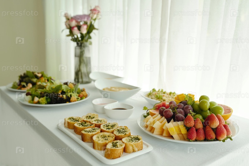 Подготовка яркого салата и фруктовой тарелки с хлебными рулонами