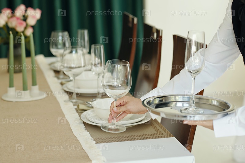Сервирование покрытой еды с винными стаканами на обеденном столе