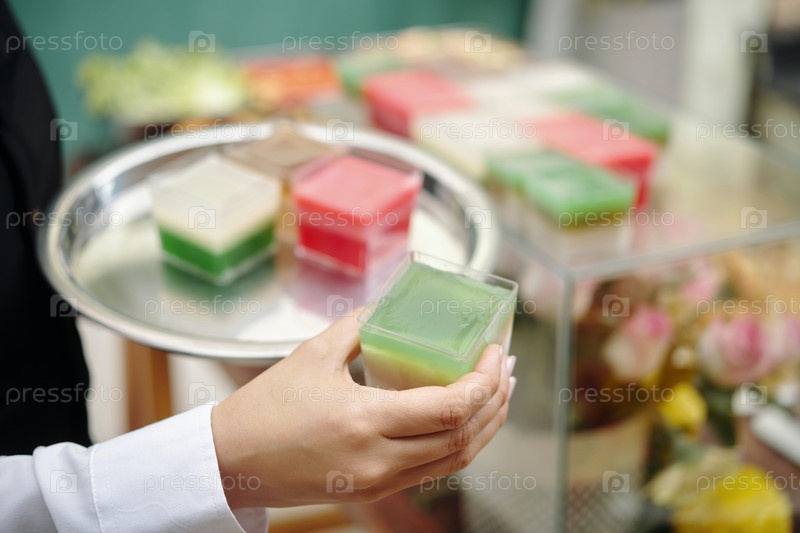 Ручная поднос с красочными кубиками мыла или желе