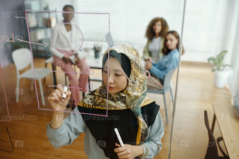 Женщина, пишущая на прозрачной доске во время встречи