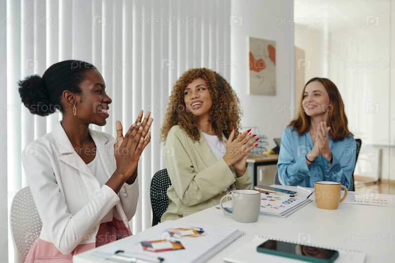 Три женщины обсуждают идеи в современном офисе