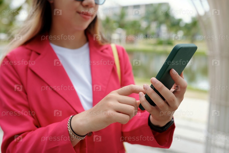 Молодая женщина в красном блейзе использует смартфон на открытом воздухе