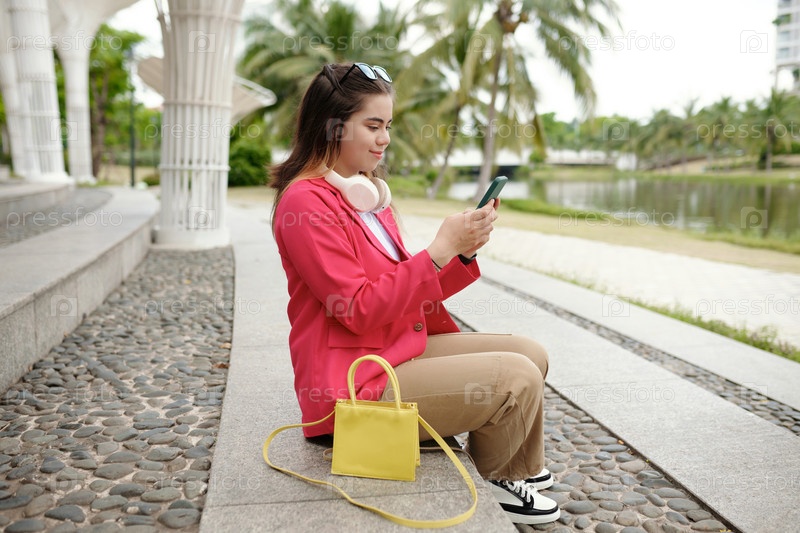Молодая женщина сидит снаружи и проверяет свой смартфон