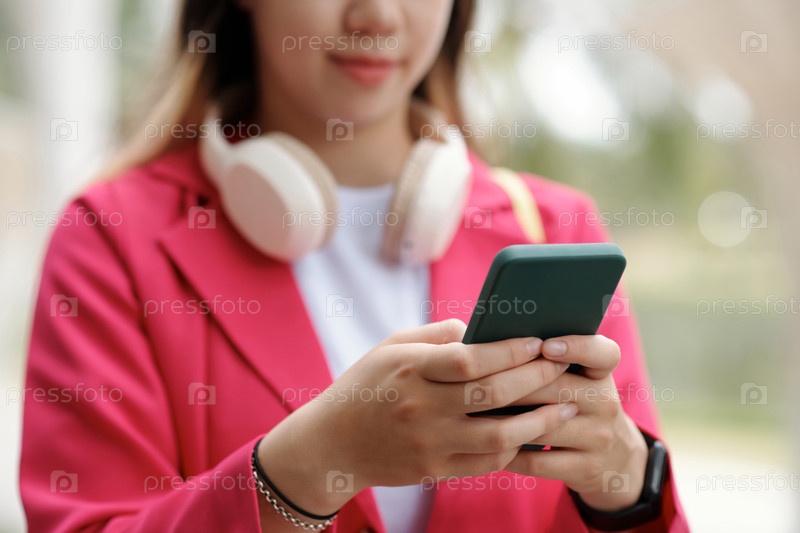 Улыбающаяся женщина использует смартфон в наружной обстановке