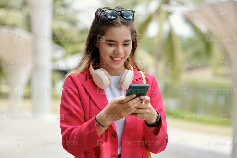Улыбающаяся женщина, которая носит наушники и использует смартфон