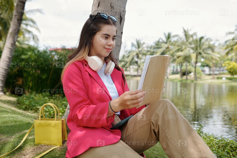 Портрет молодой женщины, читающей электронную книгу на открытом воздухе
