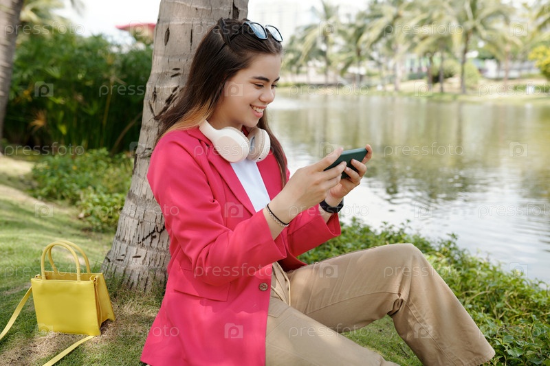 Улыбающаяся молодая женщина отдыхает у озера, держа смартфон