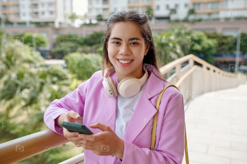 Улыбающаяся женщина с наушниками, держащая смартфон снаружи