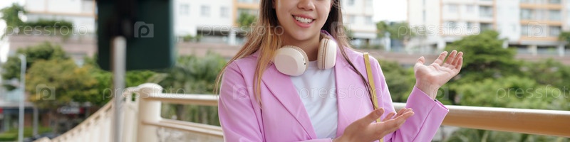 Улыбающаяся женщина жестикулирует на открытом воздухе с наушниками