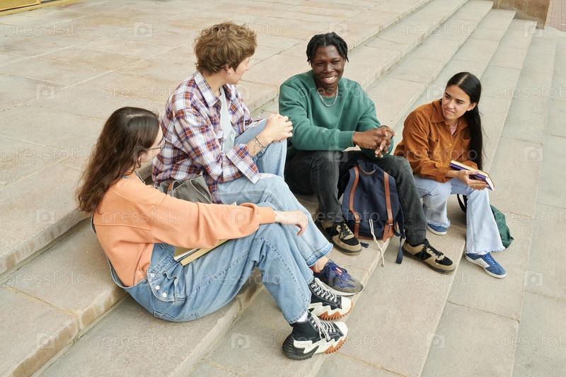 Группа друзей, сидящих на уличных ступеньках и улыбающихся