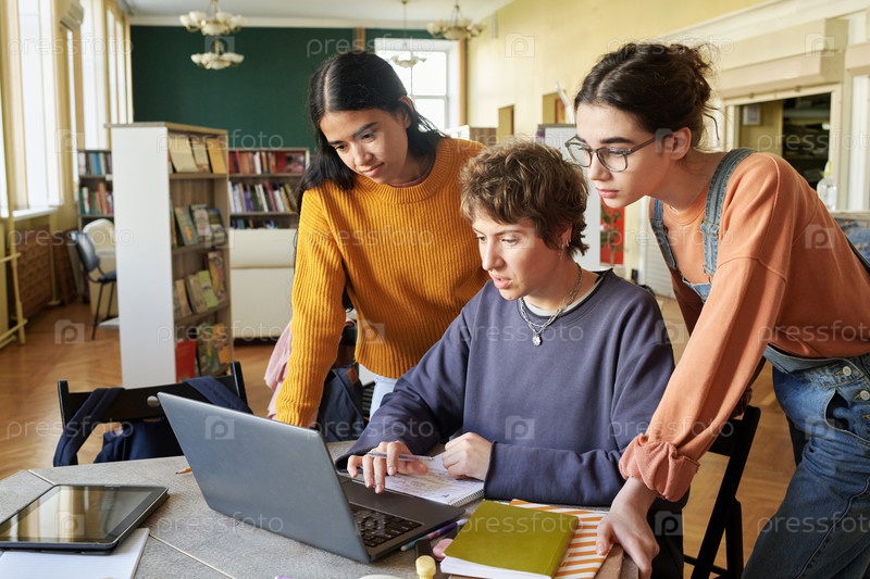 Три студента сотрудничают над общим проектом в библиотеке