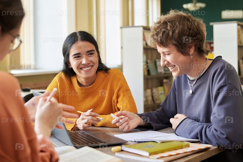 Улыбающиеся студенты учатся и сотрудничают вместе