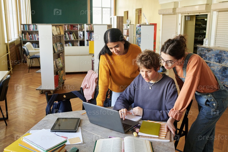 Сотрудничающие студенты работают на ноутбуке в библиотеке