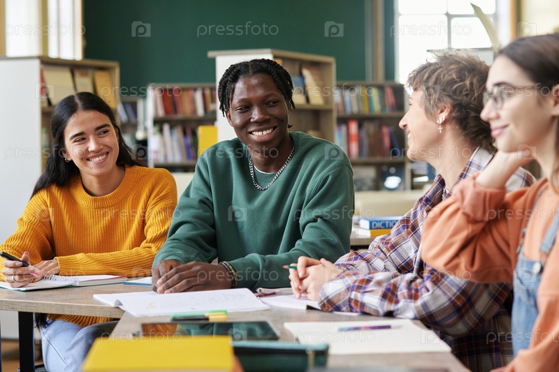 Разнообразная группа студентов, изучающих вместе в библиотеке