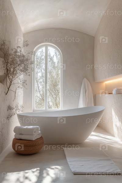 Расслабляющая минималистическая ванная комната с керамической ванной