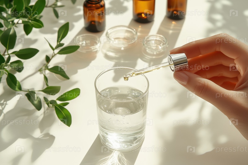 Рука, держащая ароматерапевтическое масло с зелеными листьями