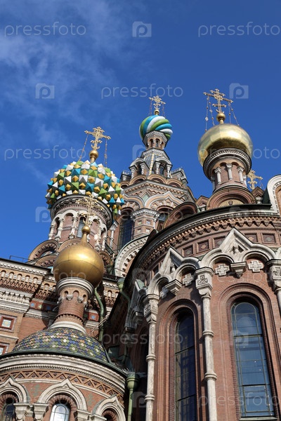 На фоне голубого неба купола храма Воскресения Христова на Крови в Санкт-Петербурге выглядят особенно нарядно