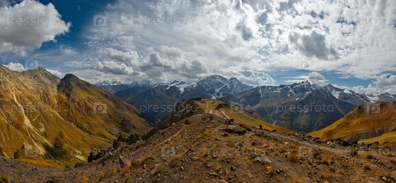 Россия. Северный Кавказ. Потрясающий вид на вершины Кавказского хребта у подножья горы Эльбрус, высочайшей горы Европы