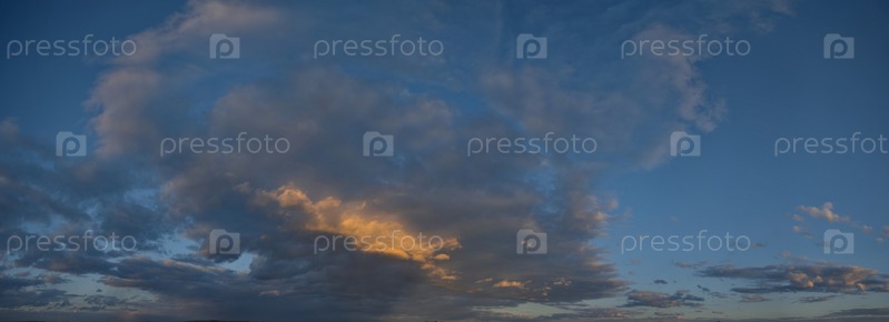 Россия. Юг Западной Сибири. Панорама вечернего летнего неба с разноцветными облаками над полями Кузнецкого Алатау
