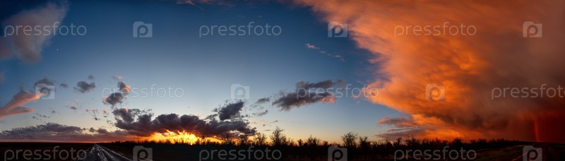Россия. Юг Западной Сибири. Панорама вечернего летнего неба с разноцветными облаками над полями Кузнецкого Алатау